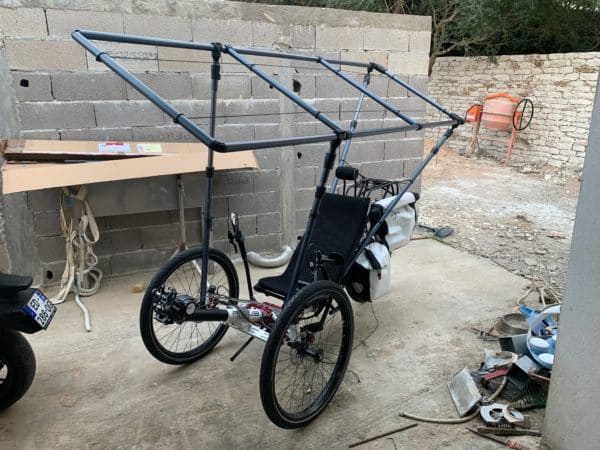 Tube-alu soutient Frédéric et Stéphane dans leur aventure de vélo solaire. Le cadre pour les panneaux a été réalisé avec des tubes aluminium et connecteurs plastiques.